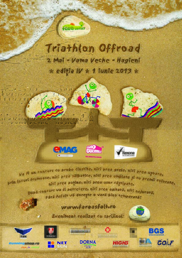 24 mai 2013 este ultima zi de înscrieri pentru a patra ediţie a triatlonului Fără Asfalt ce va fi pe 1 iunie 2013. Evenimentul este construit pe un concept ecologic, iar la cele trei ediţii precedente organizatorii au urmărit să promoveze mişcarea out-door ca alterantiva pentru petrecerile de pe plajă şi triatlonul ca variantă de reciclare a preocupărilor de fiecare zi. Anul acesta atenţia lor se focalizează pe ideea de echilibru, triatlonul devine astfel calea de mijloc către o stare de bine şi redescoperirea naturalului.